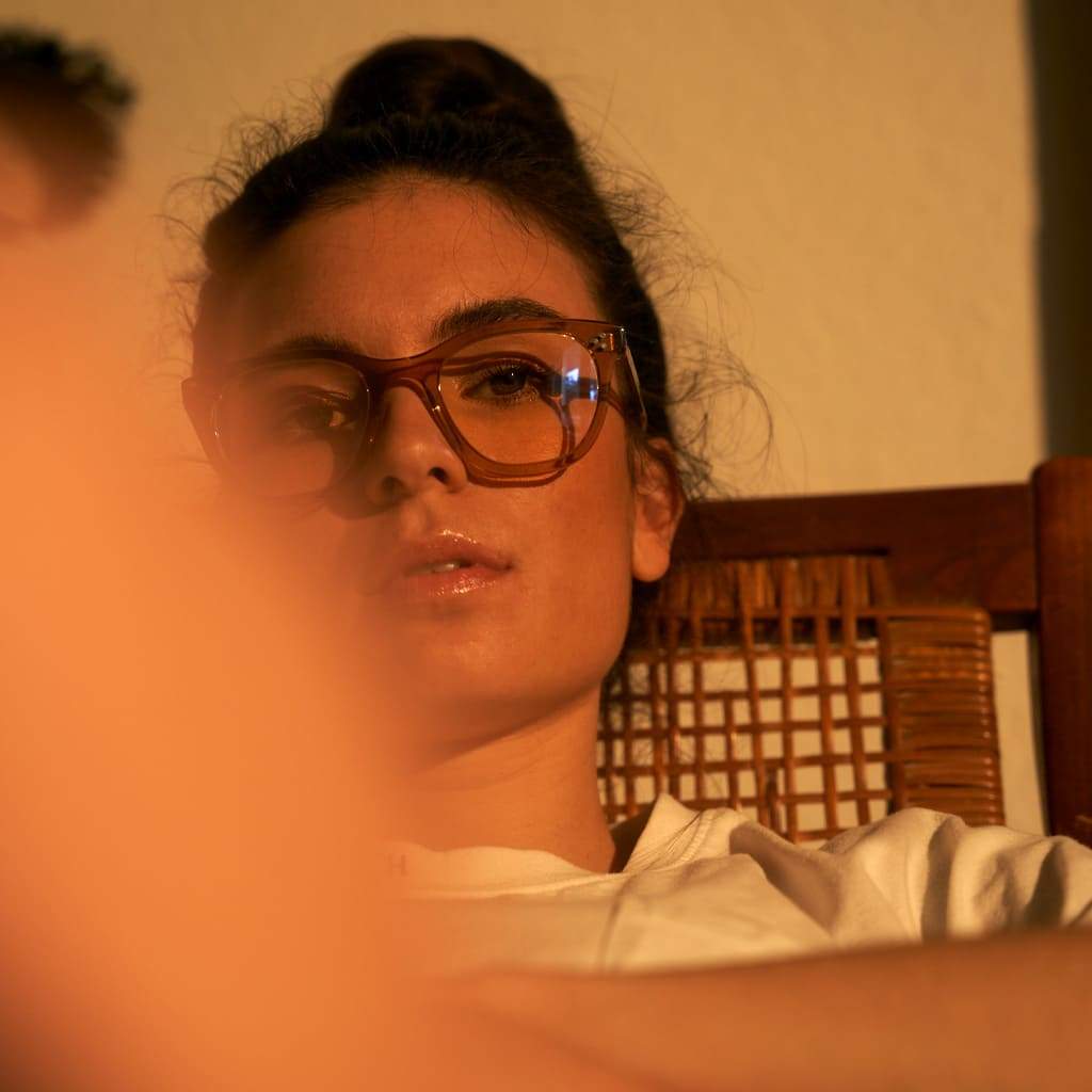 Havanna braune Acetatbrille mit dickem rechteckigen Gestell, Modell Balish, mit transparenten Bügeln.