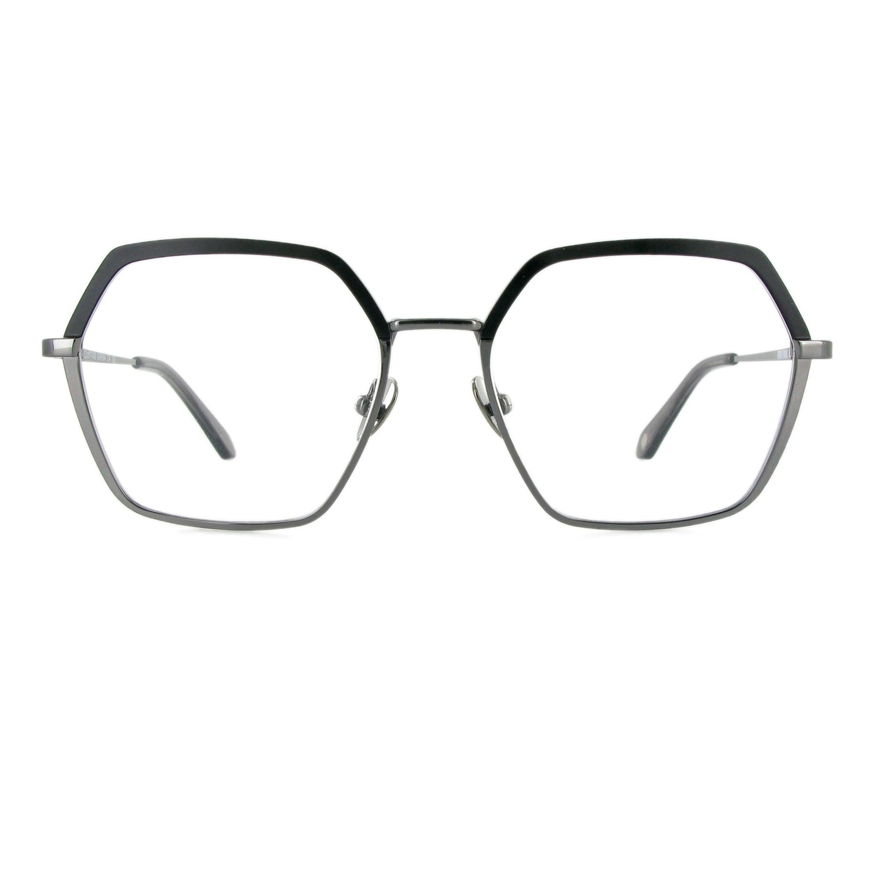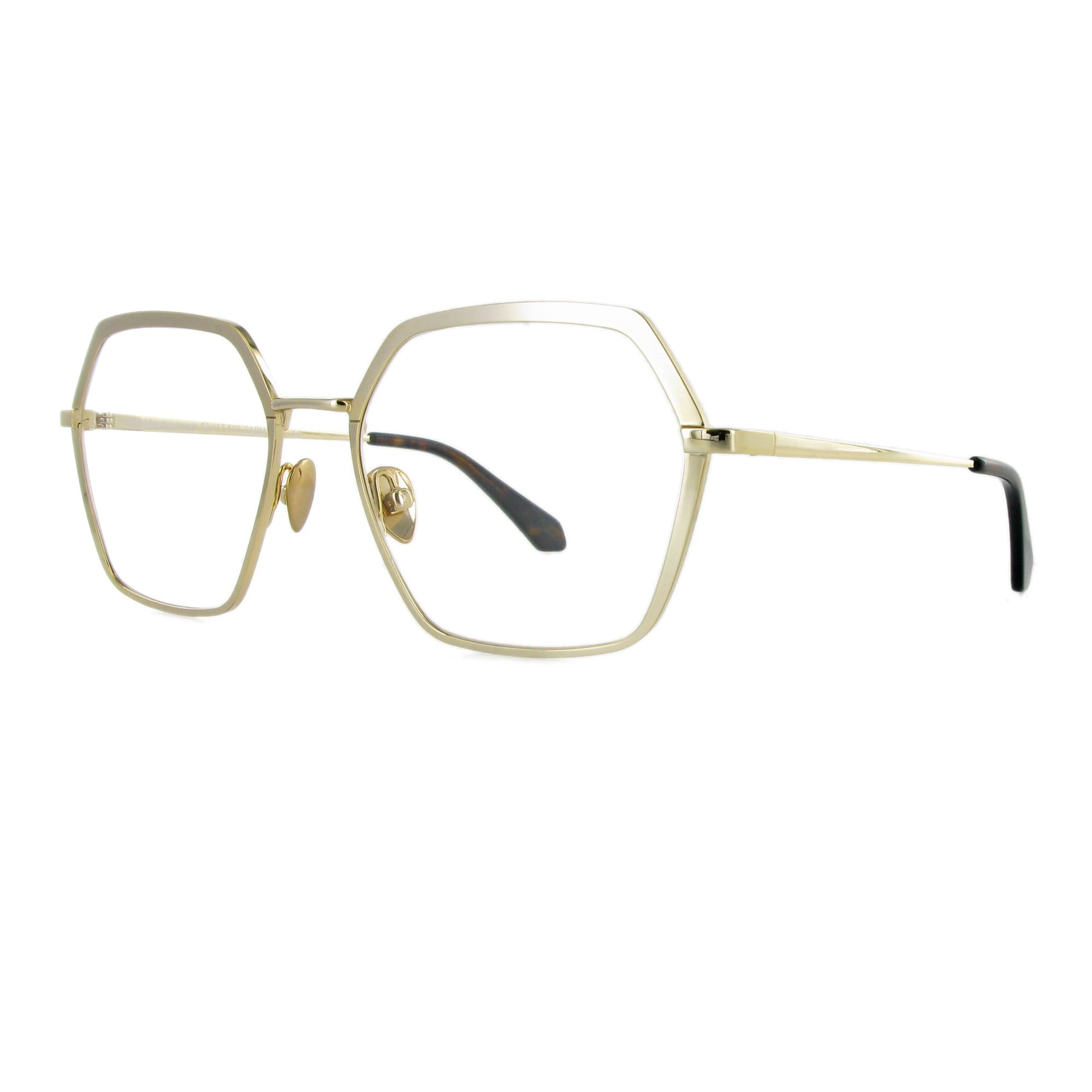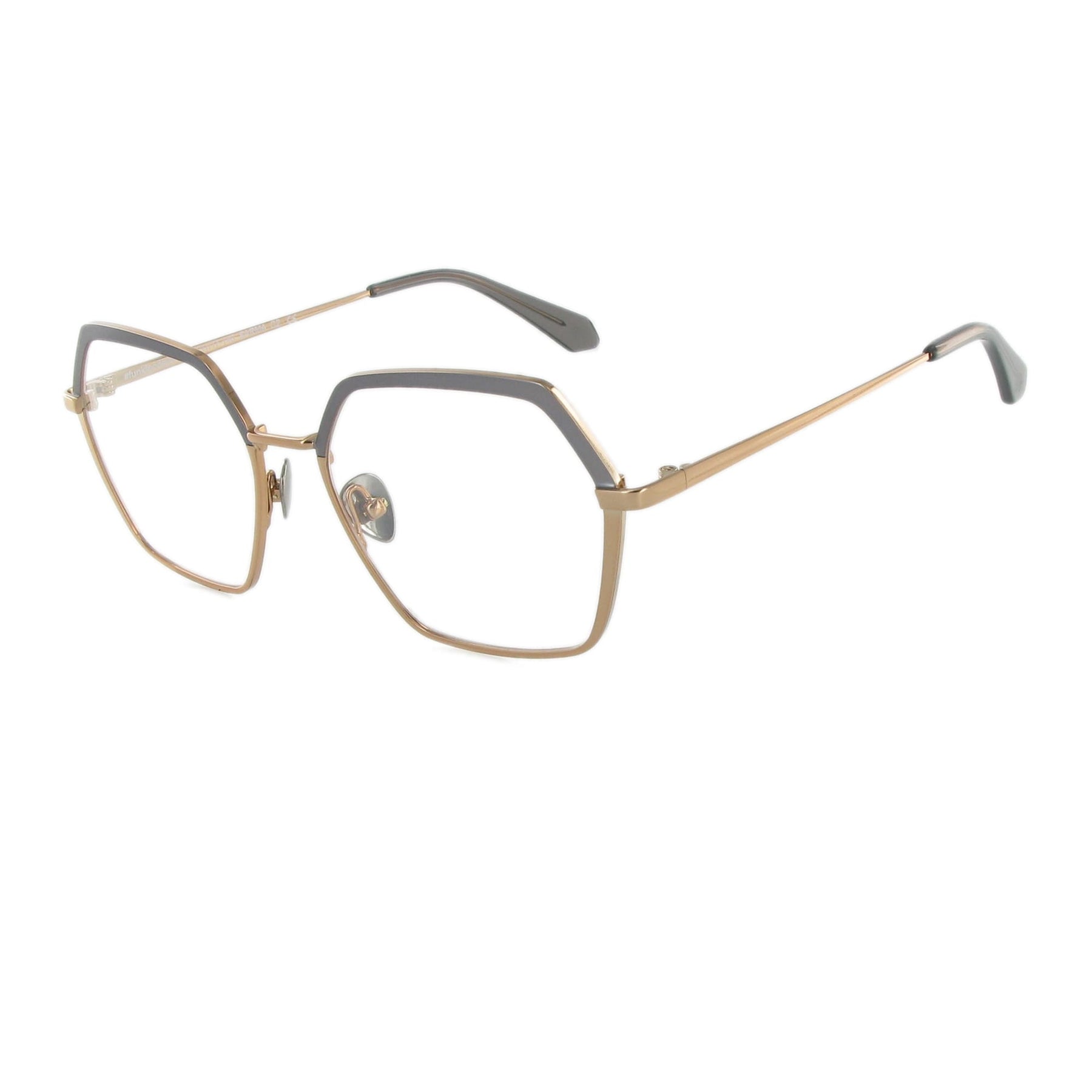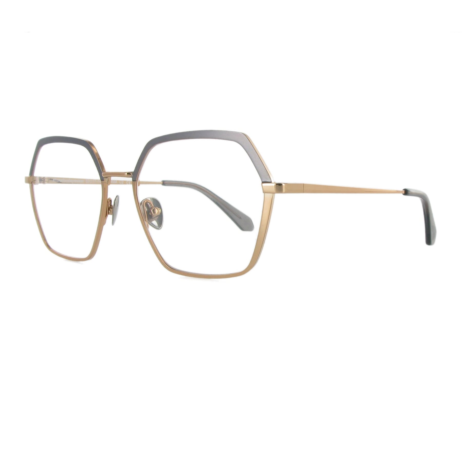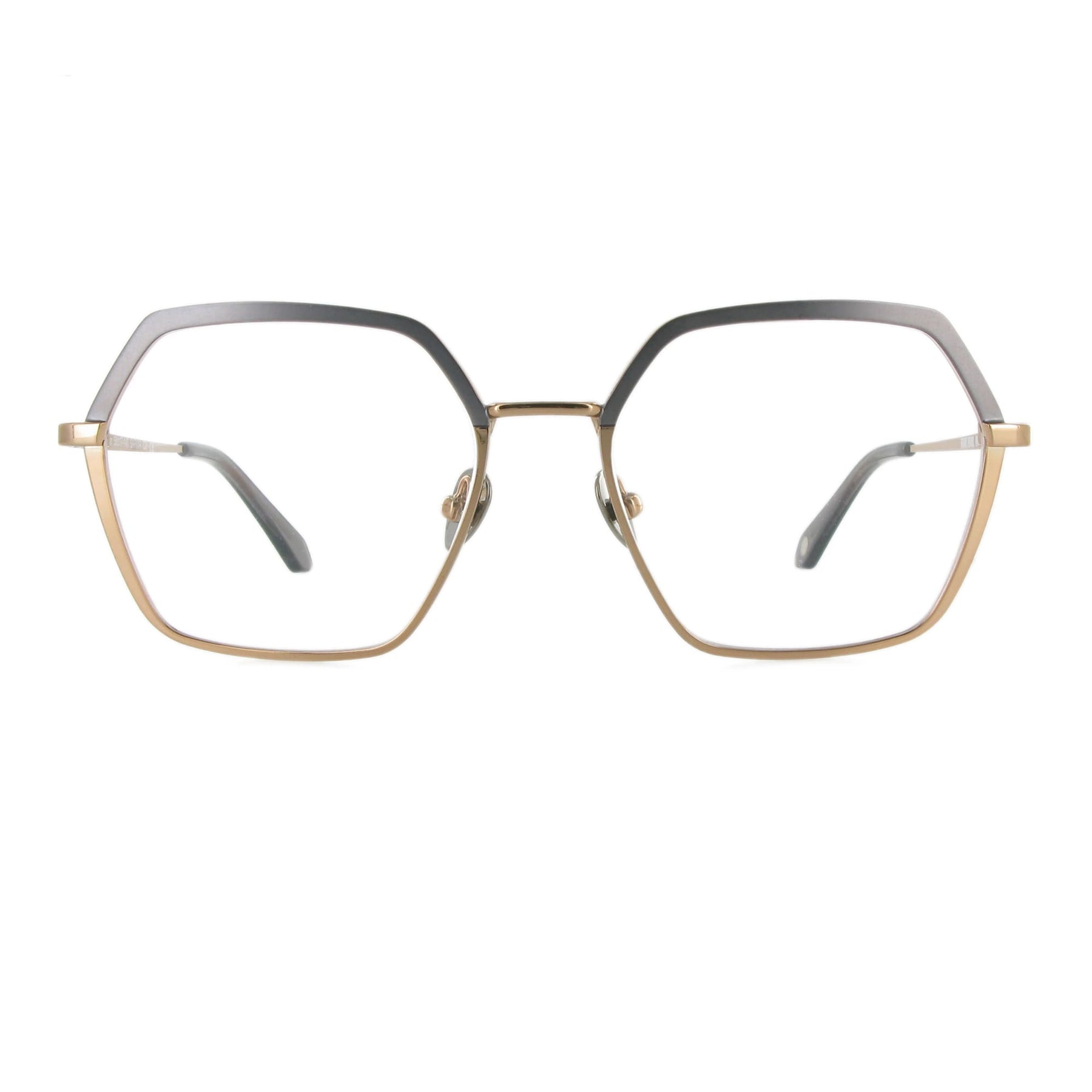 Sarma hat eine raffinierte sechseckige Statement-Form. Sie besteht aus Edelstahl und hat eine handbemalte two-tone Beschichtung im Oberrand. Die goldene Version ist extravagant, da sie oben matt und unten glänzend ist. Sie gefällt uns besonders gut. Farblich dazu passend, haben wir die Titan-Nasenpads und die Acetat-Bügelenden ausgesucht. Inklusive Brillenetui.
